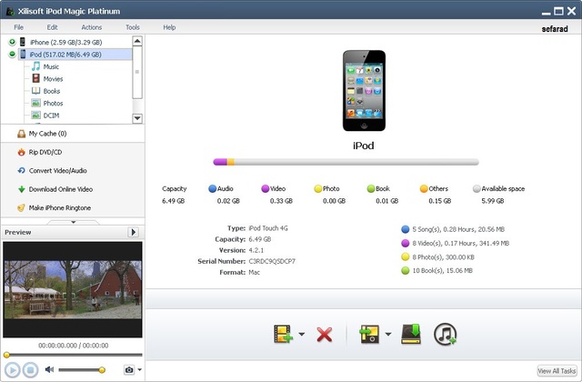 Xilisoft iPod Magic incluye en un mismo programa herramientas para copiar, ripear, convertir , gestionar y hacer copias de seguridad del contenido de tu iPod o iPhone. Con una interfaz clara y simple, Xilisoft iPod Magic detectará tu dispositivo y te ofrecerá una forma intuitiva de mover musica y vídeo de tu PC al iPod y viceversa. Además, es capaz de convertir los archivos de vídeo y audio no compatibles a formatos válidos para ser reproducidos en el iPod, incluso si se trata de DVDs. Xilisoft iPod Magic resulta también muy útil para hacer copias de seguridad de todo lo que tengas almacenado en tu iPhone o Ipod. Por último hay que destacar que Xilisoft iPod Magic es capaz de trabajar con varios dispositivos a la vez si lo que quieres es, por ejemplo, mover contenidos de un iPod a otro.