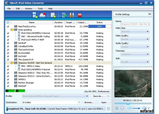 Xilisoft iPod Video Converter puede convertir ficheros de audio y vídeo en los formatos más populares a formatos compatibles con iPod. Su uso muy sencillo, en parte gracias a una interfaz de diseño sencillo. Simplemente selecciona los ficheros que quieras convertir, que se irán añadiendo a una lista, y haz clic en el botón “Encode”. El proceso se realiza de forma rápida y limpia.