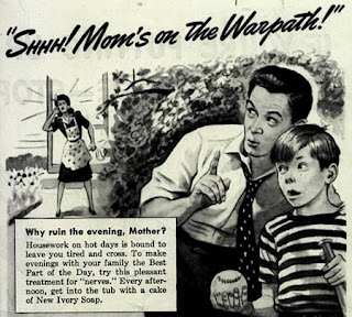 Mamá neurótica. La limpieza del hogar deja exhausta a las amas de casa, por ello tienden a estar nerviosas, enojarse y gritar. Para que no se desquitaran con sus familias y las tardes fueran placenteras, un anuncio les sugería meterse a la tina y disfrutar de un baño con el jabón New Ivory.