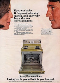 Estufa Kenmore. "Si tú supieras cuántas uñas se me han roto por limpiar la estufa, sabrías por qué quiero ésta que se limpia sola". Es lo que una mujer le dice a su marido en un anuncio que promociona la estufa Kenmore.
